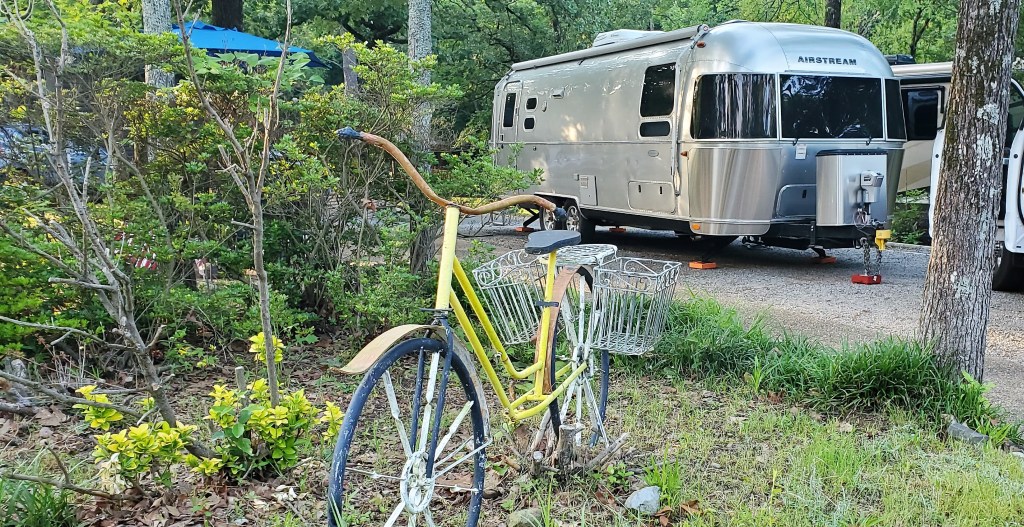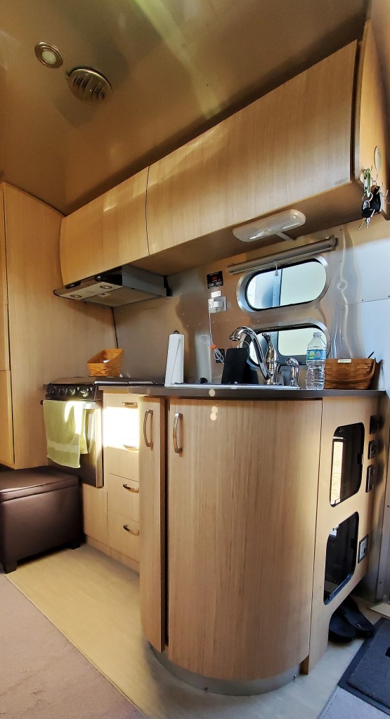 We have a galley (kitchen) that has the modern conveniences – a refrigerator, microwave, small toaster oven, induction burner and Earle’s coffee maker. We tend to not use the propane stove too often as it heats up the trailer rapidly.