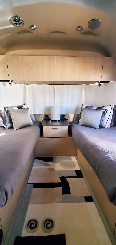 At the back end of our trailer is the bedroom. We have twin beds and it give this area a roomier feel. A second TV is in the bedroom. We can watch what we want.