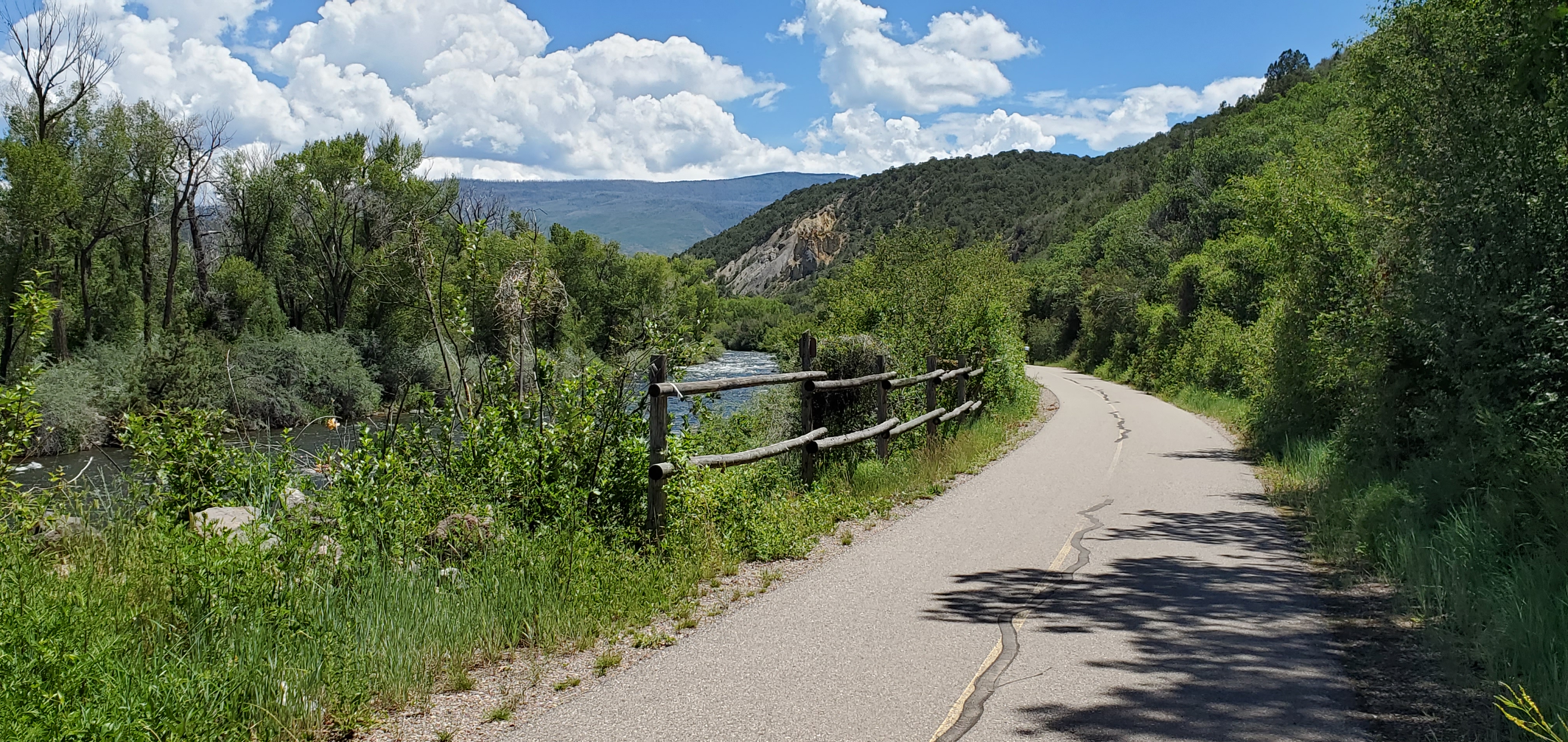 We did half of the Rio Grande Trail from Glenwood Springs to Basalt. The trail is 42 miles long and goes to Aspen. It is a typical rail trail with long 3 to 4 percent grades and wonderful descents. The recommended way to do the trail is to take the bus from Glenwood Springs to Aspen and have a wonderful descent back to Glenwood Springs. We chose to do the harder way and started in Glenwood Springs. All good as the scenery was spectacular.