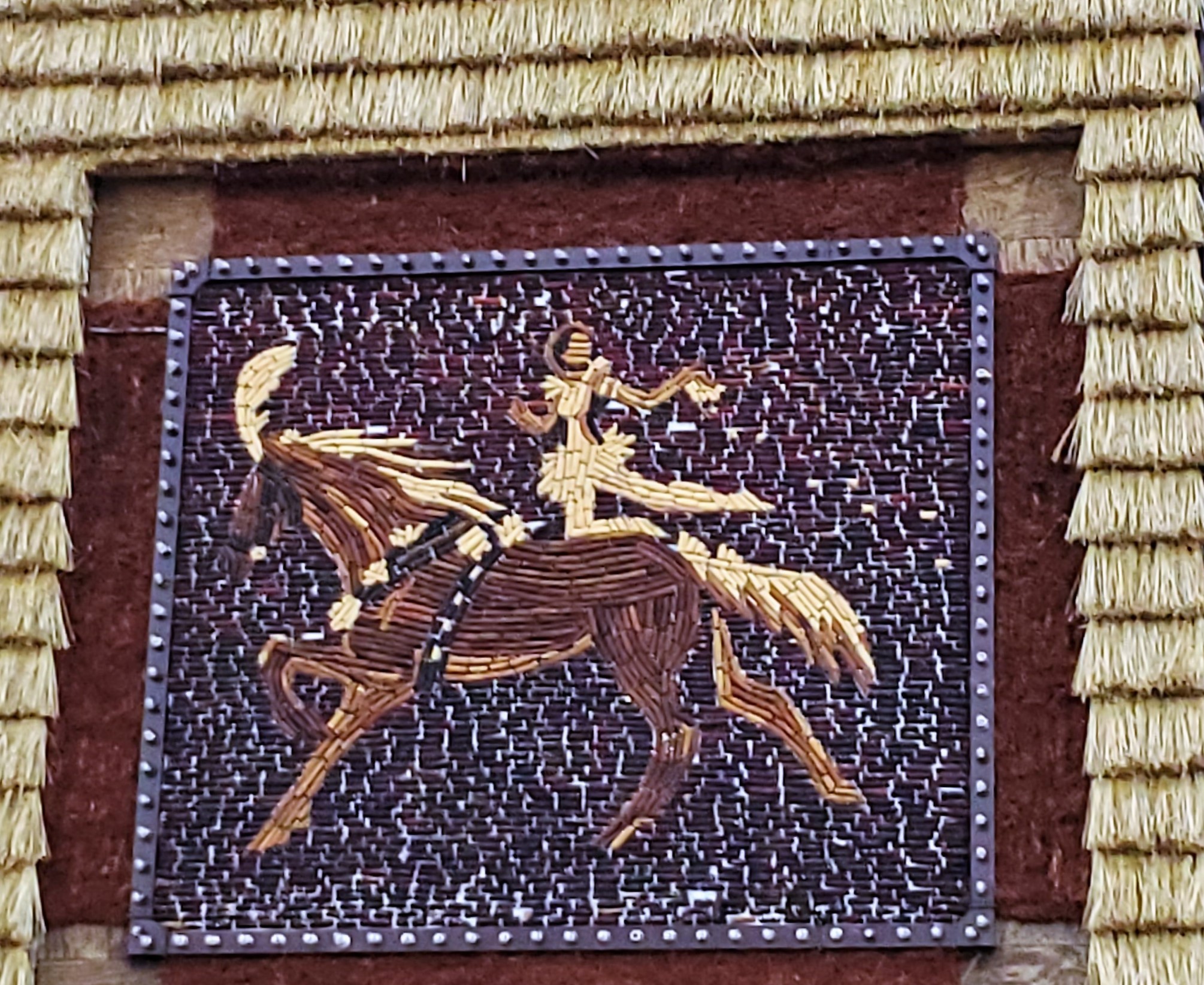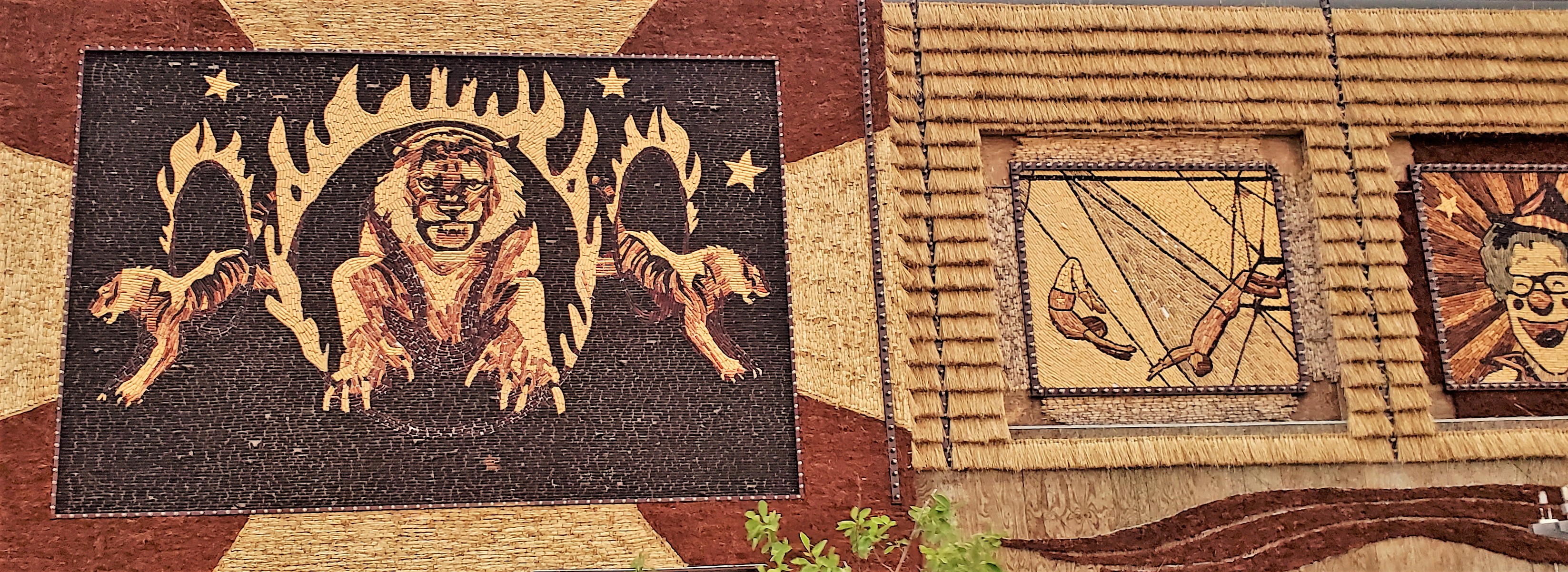Twelve naturally-occurring shades of corn are grown by local farmers to create the artwork. Artists’ drawings are transferred to black tar paper labeled with codes corresponding to colors, providing a “corn-by-numbers” pattern showing where each colored cob should be nailed. Corn cobs are split in two lengthwise and nailed to the exterior of the building, using approximately 1.5 million nails and 325,000 ears of corn.