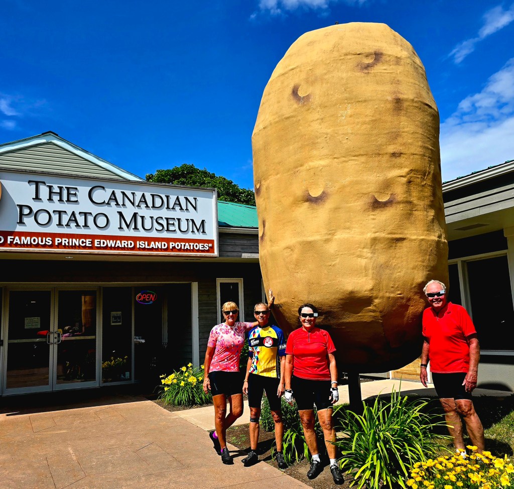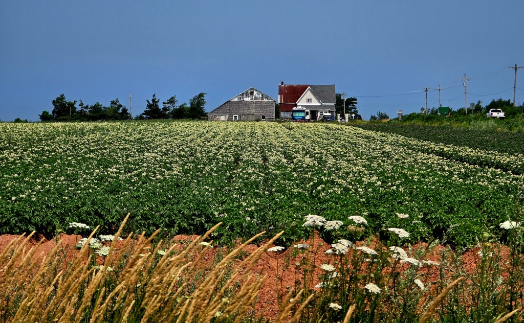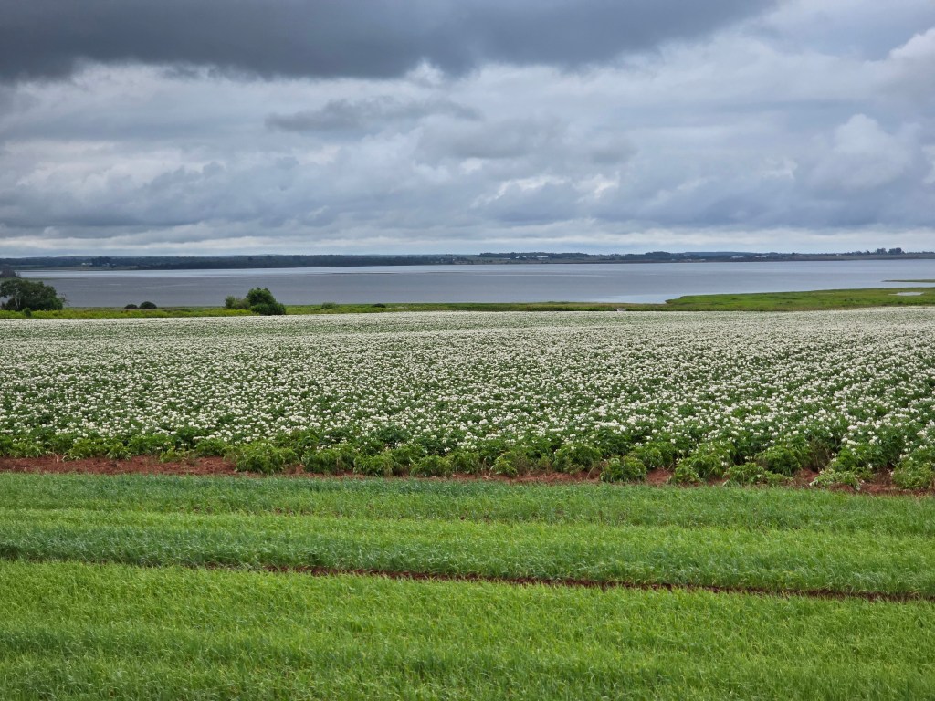 The tour started at the North Point Lighthouse and finished at the East Point Lighthouse. We ventured to the towns of Mill River, Summerside, O’Leary, Cavendish, Brackley, St. Peters Bay, Sonas and East Point. PEI has an abundance of fields of potatoes, corn and wheat/hay. Beautiful, lush green countryside with potato fields in bloom surrounded us each day.