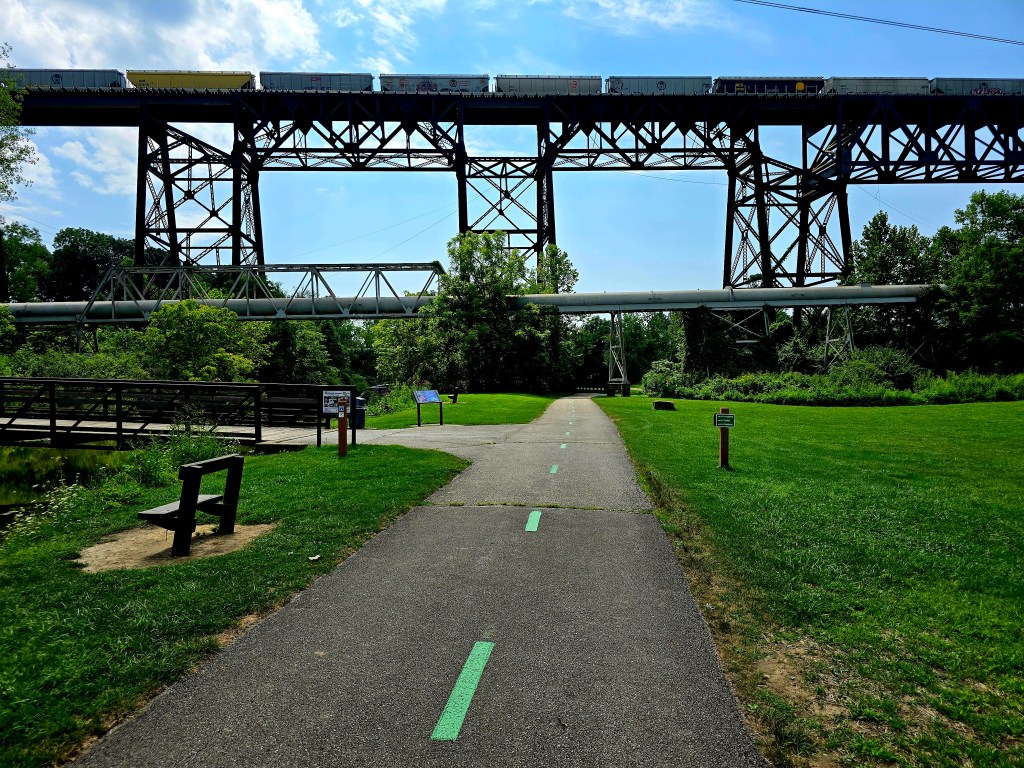 Our last bike ride of the trip was in Cuyahoga Valley National Park. We opted to do the trail north towards downtown Cleveland. It was a good decision on our part. Many of the secondary roads in the area were closed and under construction, but we had clear sailing on the trail. It was very pleasant and as our friend Roger told us, this is one of the smoothest chip stone trails in the country and is better than some paved trails.